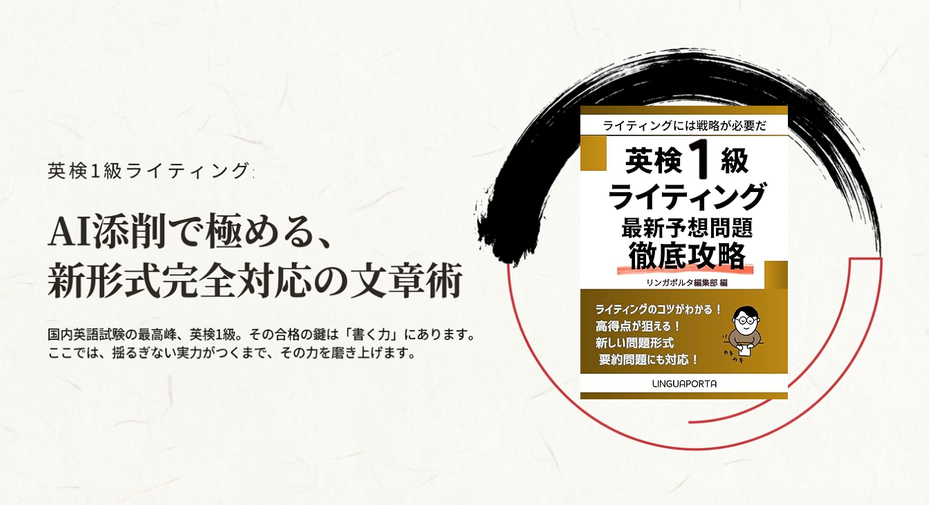 定評ある『英検1級 ライティング最新予想問題徹底攻略』(リンガポルタ)の内容に基づいた学習が可能。本とサイトを併用することで、より戦略的な対策が実現します。(※書籍をお持ちでない方もご利用いただけます)