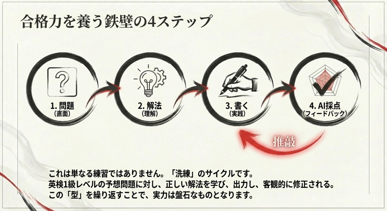 磨き上げる(Refine): まずは「添削なし」でAIのヒントを得て自力で修正。最後に「添削あり」で模範解答を確認。この反復が、あなたの「書く力」を劇的に変えます。
